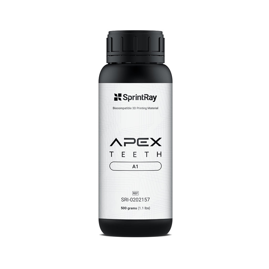 SprintRay APEX Teeth: biocompatible 3D printing denture teeth resin. Exceeds high-impact ISO standards for mechanical properties. Part of a complete digital workflow for on-demand dentures. Shades: A1, A2, B2, and Bleach.